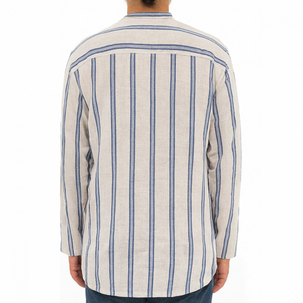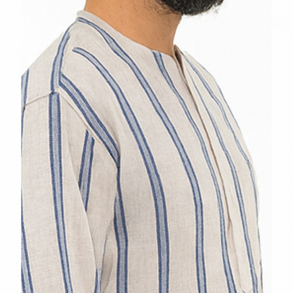 Hakim Yaka 3 Düğmeli Keten Çizgili Gömlek - Mavi